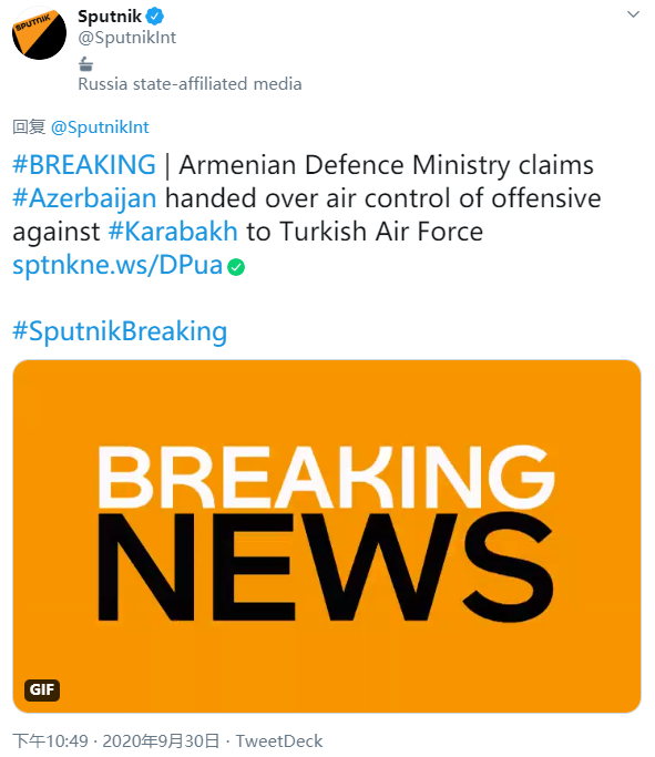 俄罗斯卫星通讯社9月30日消息,亚美尼亚国防部称,阿塞拜疆已将对卡拉巴赫的制空权移交给土耳其空军。