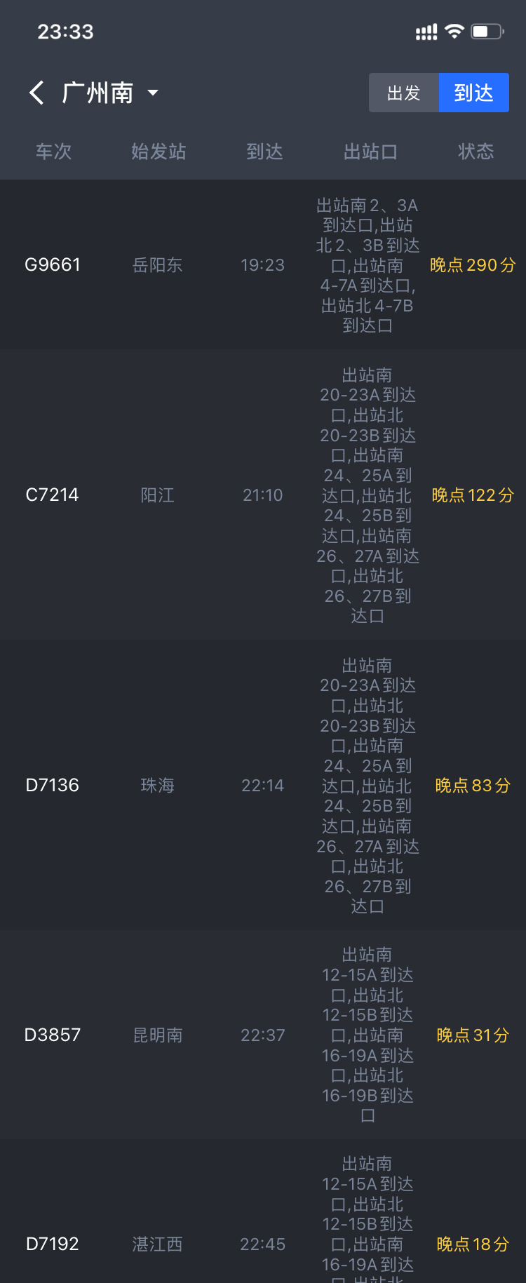 据“掌上高铁”显示,昨天晚上11点33分,广州南站仍有几十趟高铁晚点,包括来自岳阳、珠海、昆明、湛江、淮南、兰州、南宁等方向的列车。当时晚点时间最长的为岳阳东开往广州南的G9661列车,晚点将近5个小时,其他列车晚点时间短则几分钟,长至一两个小时。