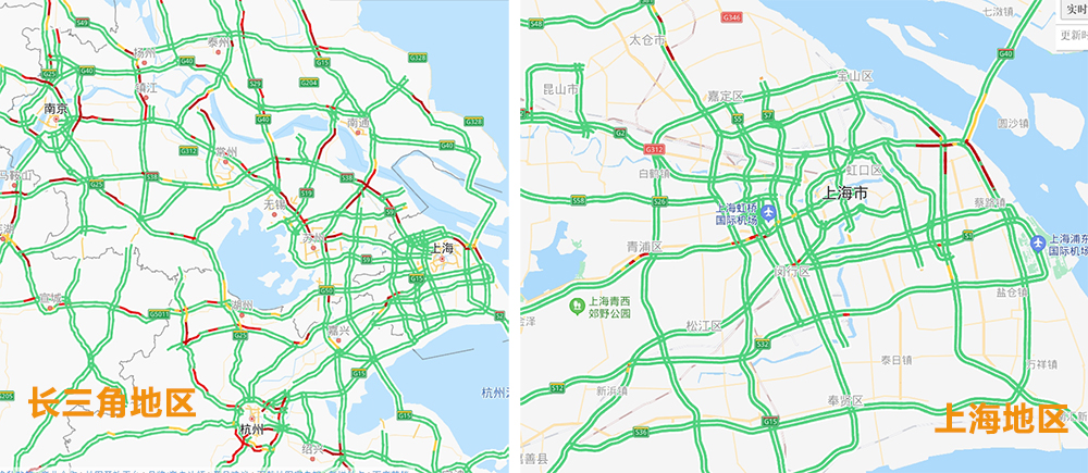 今天早上8点左右,长三角地区同样出现多条拥堵路段。不过上海地区交通状况良好,除了通往崇明岛方向的路段少量拥堵,大部分地区通行畅通。