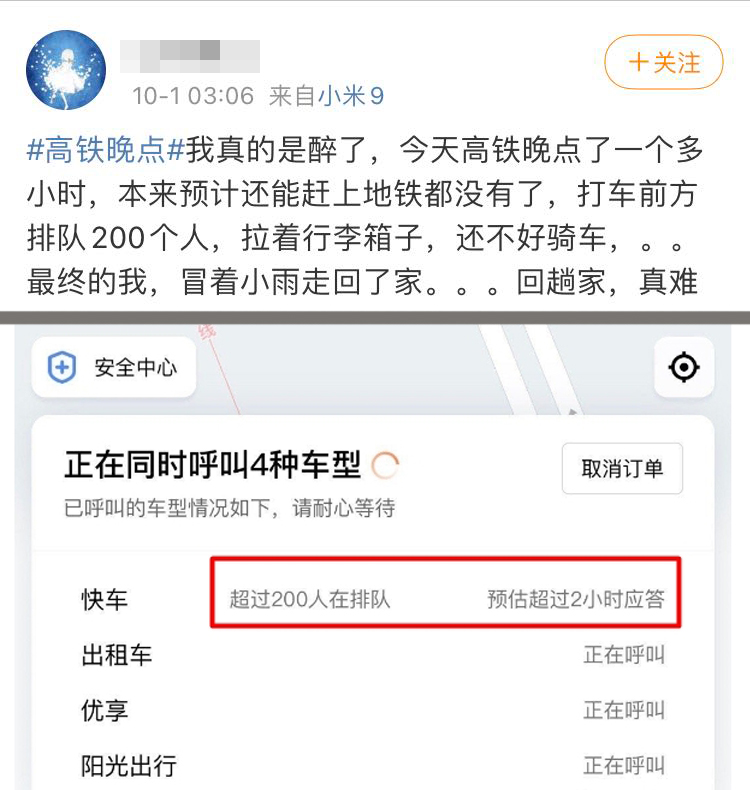 今天,一位乘客在高铁晚点1个多小时后到达西安北站,却发现打不到车,最后只能走路回家。滴滴出行APP显示,排队人数超过200人,等候时间超过2小时。