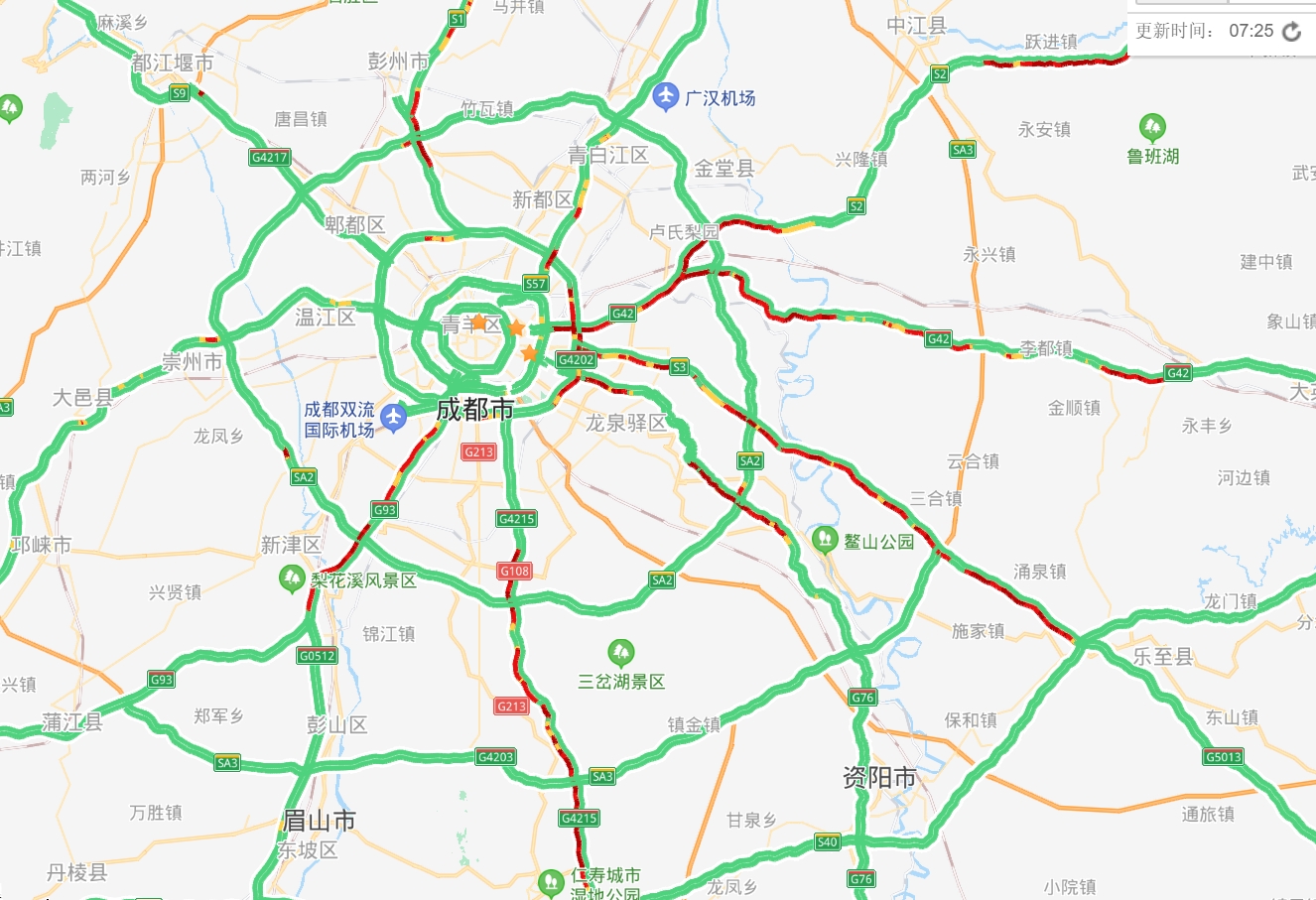 百度地图显示,今天(10月1日)早上7点25分,成都多条出城高速公路就已经极度拥堵。界面新闻使用地图测距功能测算,成都东南方向拥堵及缓行路段长达80公里。
