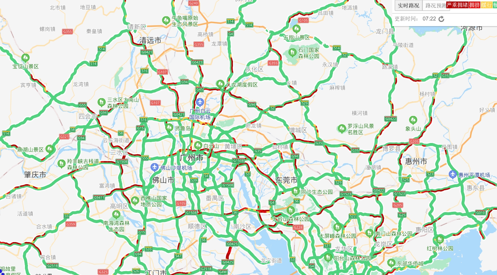大湾区同样拥堵严重。今天早上7点22分,广州、惠州、清远、肇庆等地的高速公路网大范围变红。高德地图发布的报告显示,国庆中秋假期,全国十大热门高速中,有五条在大湾区,其中京港澳高速广州段最拥堵。