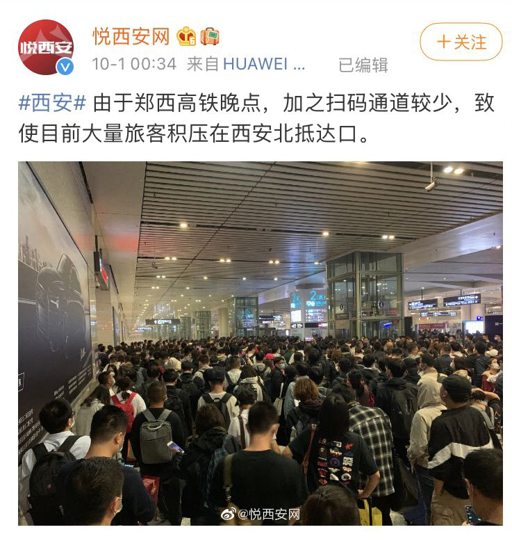 由于高铁晚点,部分车站出站口出现旅客积压。据悦西安网发布的消息,在凌晨时分,西安北站出站口仍有大量旅客排队等候出站。