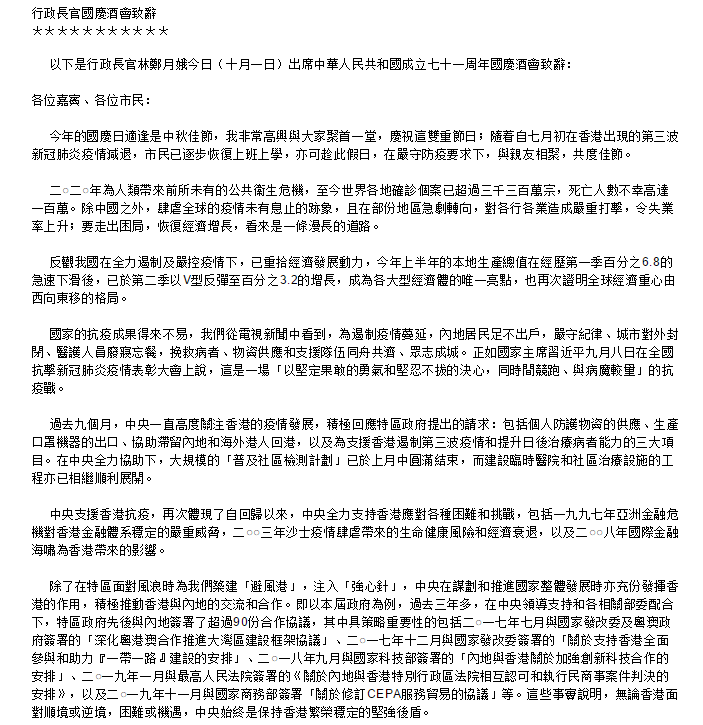 据香港特别行政区政府新闻公报,港行政长官林郑月娥今天(10月1日)出席国庆酒会时表示,香港经历去年修例风波及国安法,要解决经济挑战及市民对民生民主诉求,必须要有安全社会环境,她还批评部分持双重标准的外国政府对执行香港国安法的机关作出多少无理指控,并实施所谓“制裁”,她与相关官员会无畏无惧,坚定维护国家安全。