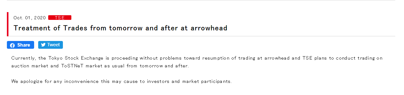 10月1日消息,东京证券交易所(Tokyo Stock Exchange)在其官网发文称,目前,东京证券交易所在arrowhead恢复交易方面进展顺利,东京证券交易所(TSE)计划从明天及以后照常在拍卖市场和东京证券交易所交易网络系统(ToSTNeT)市场进行交易。
