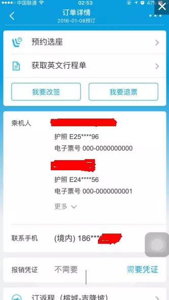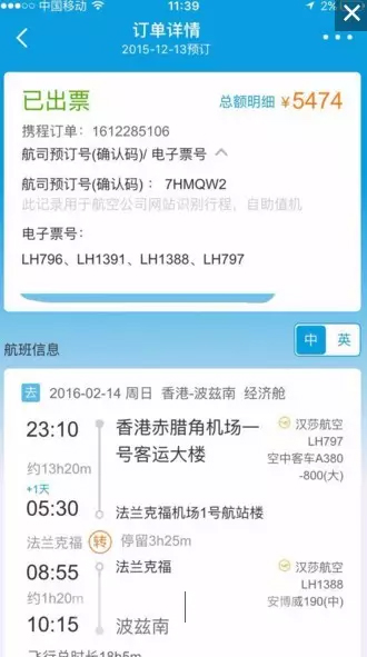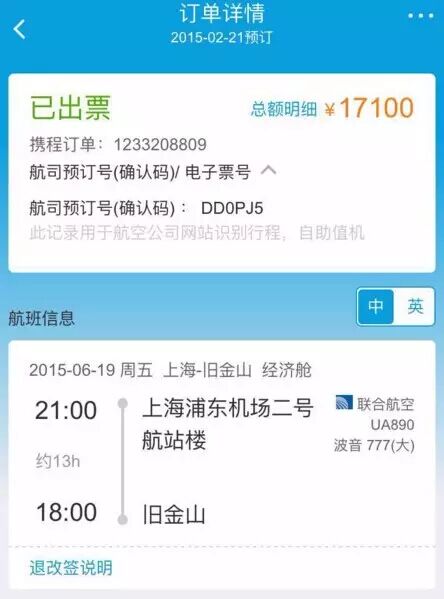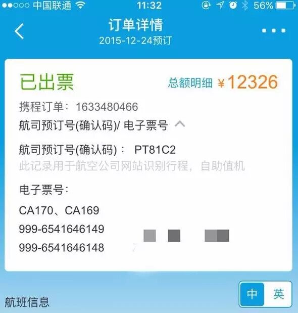 从很多朋友留言中,以及我个人在携程上这半年订的那几十张机票来说(所以喷我做旅行其实是携程竞争对手的,你听说过哪个竞争对手给对方送上自己全部的机票订单的?),携程出票后,拿不到电子客票号,或者拿到了与自己乘机不同的电子客票号的,不是少数。看看这个朋友发来的订单,帮我找找那个所谓的电子票号。