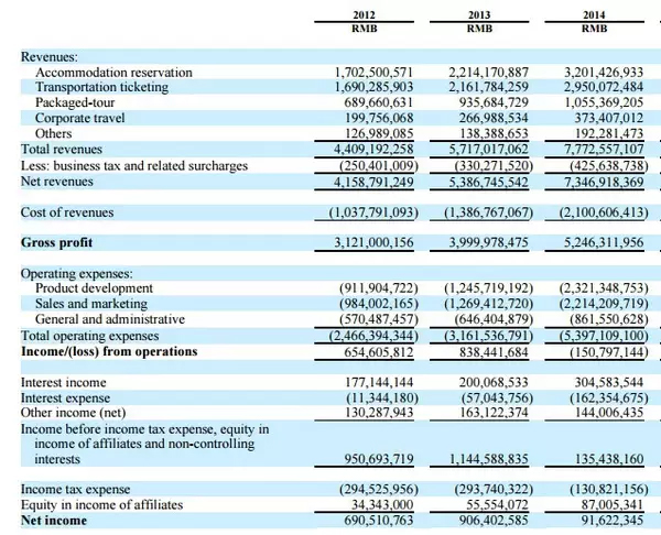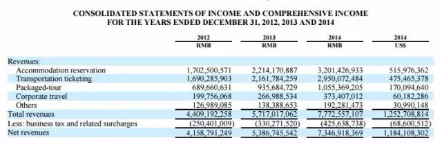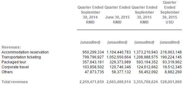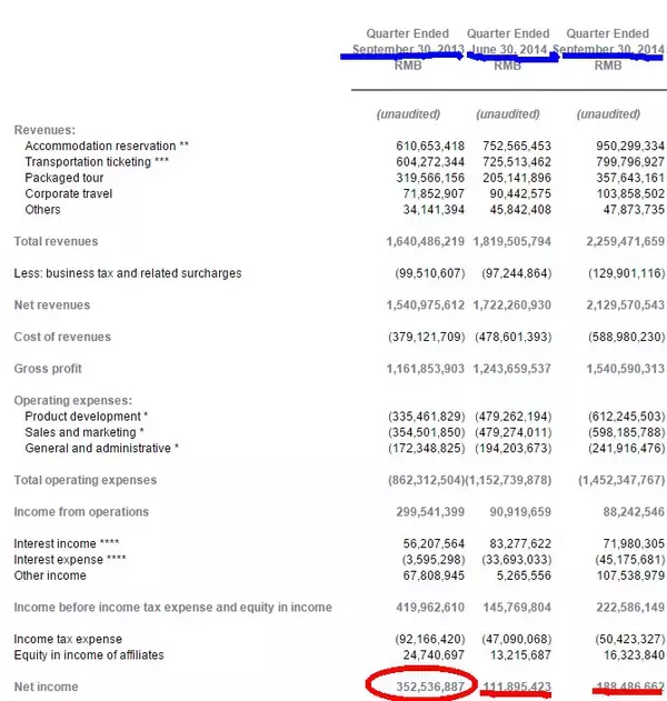 这里我们使用携程官网上发布的2014年财报和2015年Q3财报上的数字: