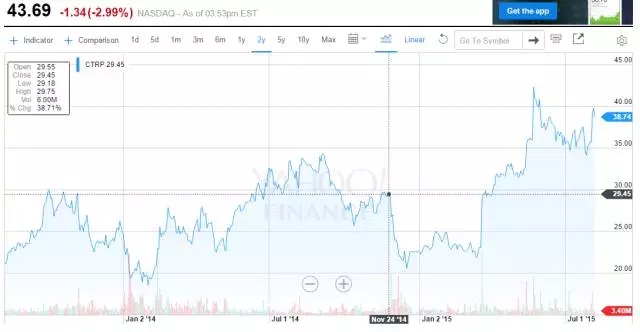股价从11月25日的29.23,狂跌至12月16日的20.58,跌幅达到了30%。直到2015年3月19日,携程公布了2014年的四季报Ctrip - Investor Relations,股价才得到了修复。