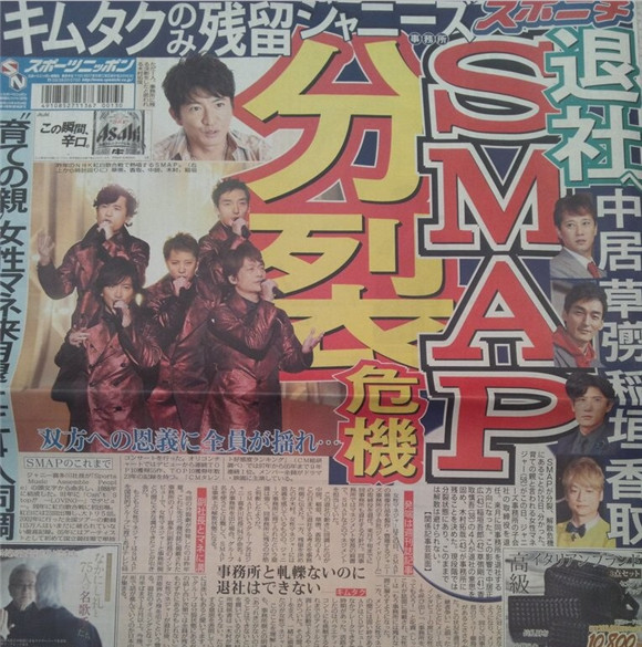 即使如此,如果其余四人真正出走,就会造成了SMAP事实上的解散。这个消息瞬间引爆了日本娱乐圈,不仅占据了今天各大报纸的头条,电视台也一早开始播送这个消息。
