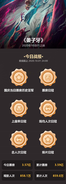 从突破2亿,到3亿,再到国庆首日全日票房站上3.58亿元,截至发稿至,《姜子牙》两日票房已突破4.57亿元,晋身今年票房榜5名,距离第二名《宠爱》5.1亿元的总票房也不远了。