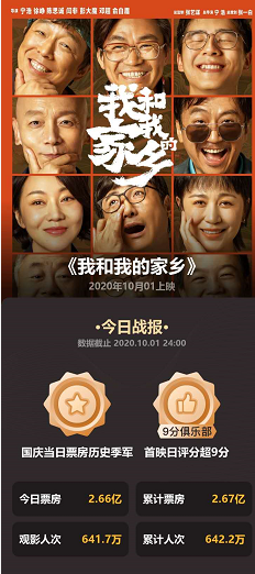 国庆长假首日,票房仅次于《姜子牙》的,则是由北京文化出品的《我和我的家乡》,首日票房达到2.67亿元,截至发稿,两日票房达到3.25亿元,后劲十足,该片豆瓣评分7.5分。