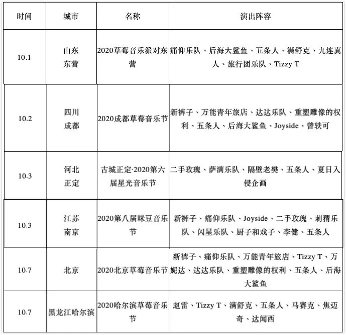 在《乐夏2》热播期间,我们迎来了疫情后的第一个大长假,线下演出市场中的音乐节自然迎来了一个小爆发,据媒体的不完全统计,8天时间全国共有20多场音乐节举办,其中大品牌如草莓音乐节,就在4个省市同时开演。