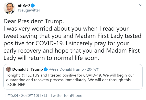 菅义伟在推文中写道:“亲爱的特朗普总统,当我看到你的推文写道,你和第一夫人的新冠检测呈阳性时,我非常担心你。衷心地祝愿你早日康复,希望你和第一夫人早日恢复正常生活。”