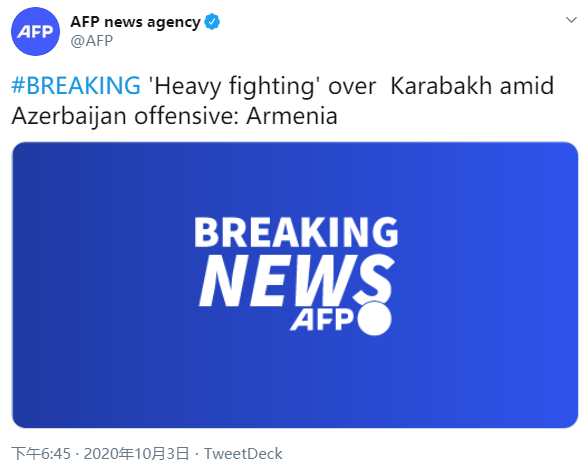 法新社10月3日援引亚美尼亚方面消息称,亚美尼亚军队和阿塞拜疆军队在纳卡地区发生“激烈战斗”。