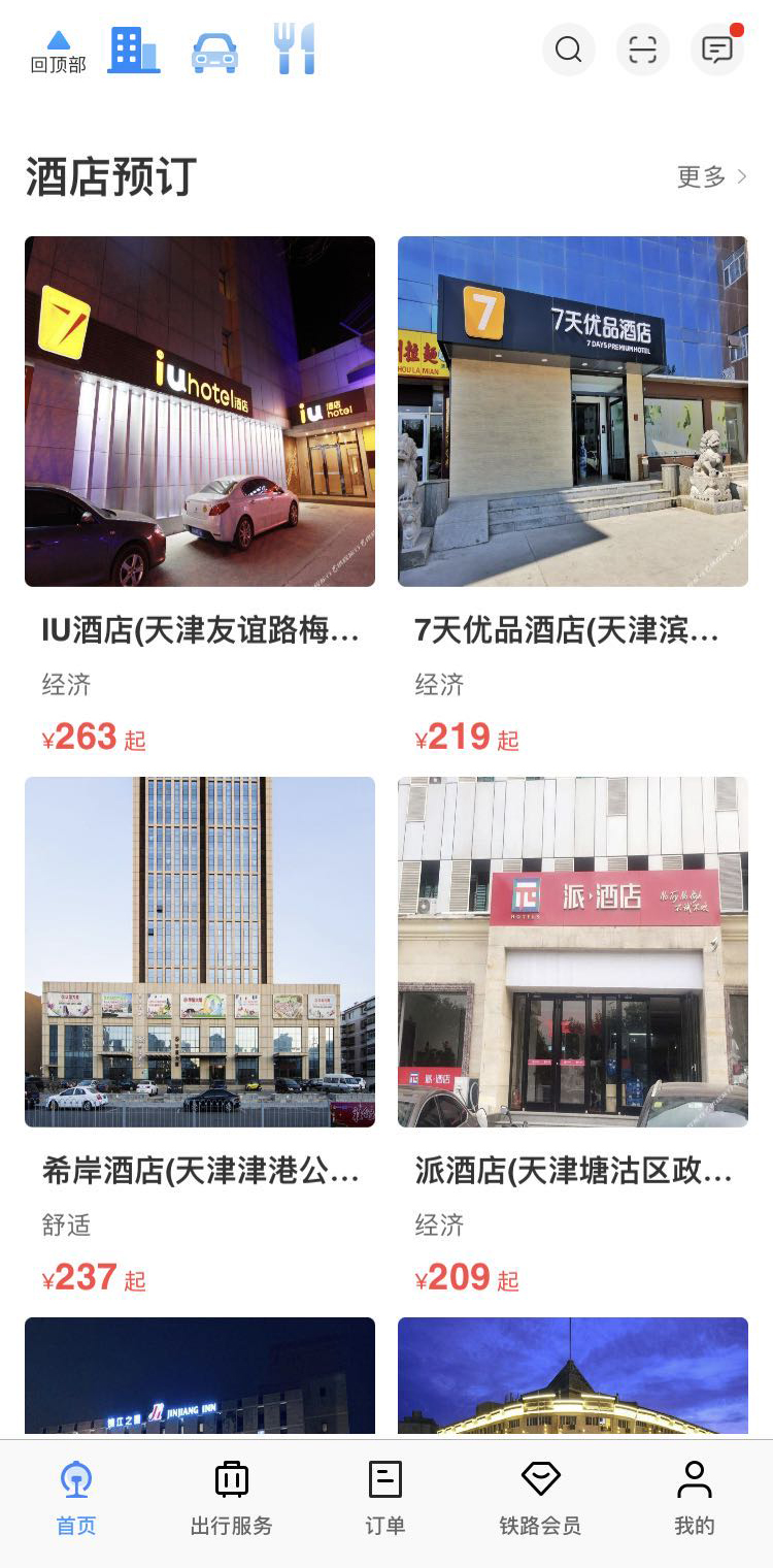 酒店推荐出现在12306 APP首页,直接下滑即可看到。12306将酒店推荐与目的地关联,在乘客搜索或者订票后,首页下方会出现目的地所在城市的酒店。比如当记者预订了北京至天津的火车票后,首页下方就出现了天津地区的酒店。据记者观察,首页推荐的大多是经济型酒店,但并非在火车站附近,进入详情页后可以查看更多酒店。