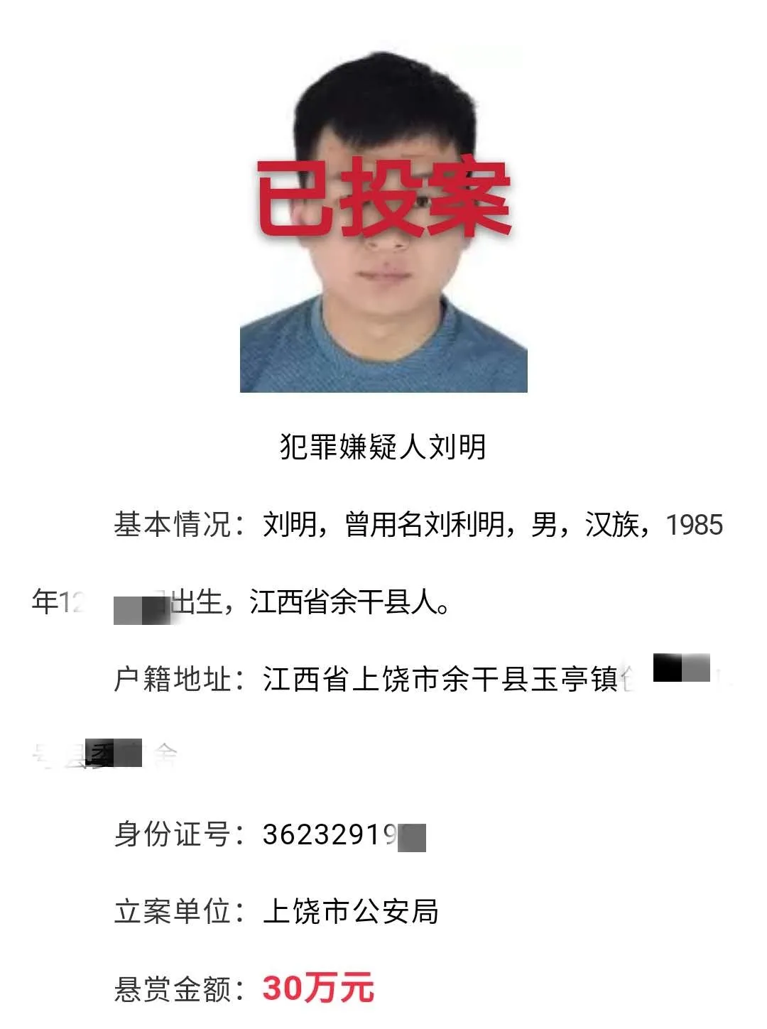 据江西省余干县公安局消息,10月3日,迫于公安机关强大的追捕压力和政策的感召,涉黑网上逃犯刘明到余干县公安局投案自首。目前,犯罪嫌疑人刘明已被警方依法刑事拘留,案件正在进一步侦办中。