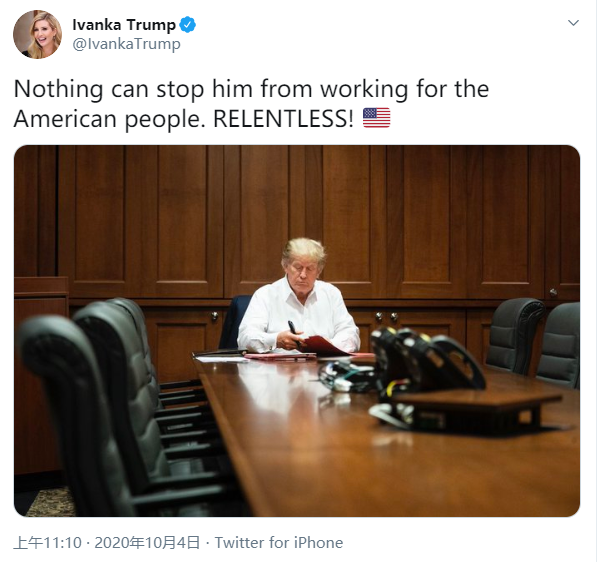 特朗普的女儿伊万卡在推特上贴出了父亲的“工作照”,并写道:“没有什么事可以阻止他为美国人民工作,坚持不懈!”