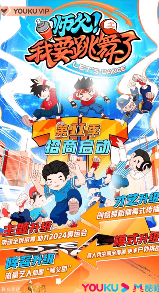 另外,还有街舞教学明星体验真人秀《师父!我要跳舞了》,在前一季基础之上,第二季将在艺人、主题、场景等方面进行全新升级,助力2024年Breaking作为体育街舞入局奥运。