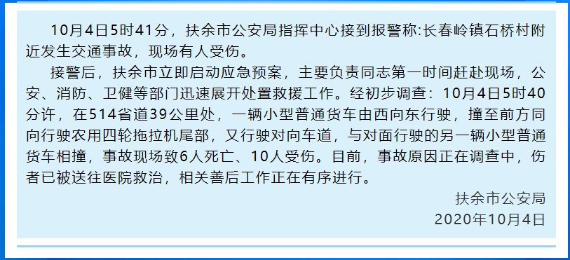 接警后,扶余市立即启动应急预案,主要负责同志第一时间赶赴现场,公安、消防、卫健等部门迅速展开处置救援工作。经初步调查:10月4日5时40分许,在514省道39公里处,一辆小型普通货车由西向东行驶,撞至前方同向行驶农用四轮拖拉机尾部,又行驶对向车道,与对面行驶的另一辆小型普通货车相撞,事故现场致6人死亡、10人受伤。目前,事故原因正在调查中,伤者已被送往医院救治,相关善后工作正在有序进行。