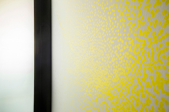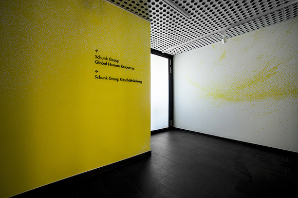 与我们此前报道过的由草间弥生创作的互动式装置作品“消融屋”的创作原理类似,22quadrat 发动 Schunk Group 的员工也加入了团队式波点创作的队伍——他们手拿荧光黄色的彩笔,一笔一笔摁满了好几面墙。