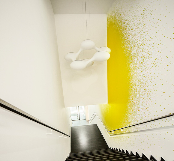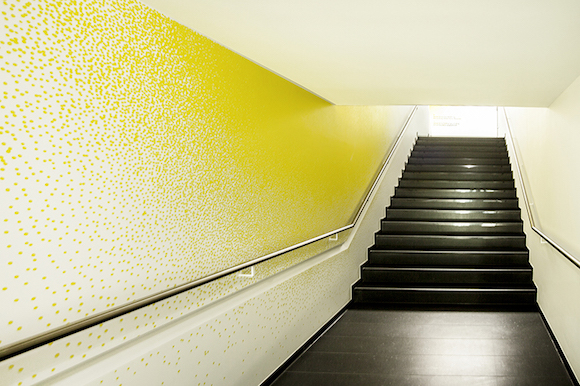 最终,员工们一共让 600 个黄色波点上了墙,它们分布在办公室入口、楼梯边的围墙,疏密有序,实现了渐变的视觉效果,加上黄色本就鲜亮,使得走过路过的行人心情自然地会愉悦起来。而且,相信因为参与了整个创作过程,员工们除了每天都能得到视觉上的愉悦,也会因为一种参与感而收获更多的喜悦,甚至还会因此对企业产生更大的归属感。