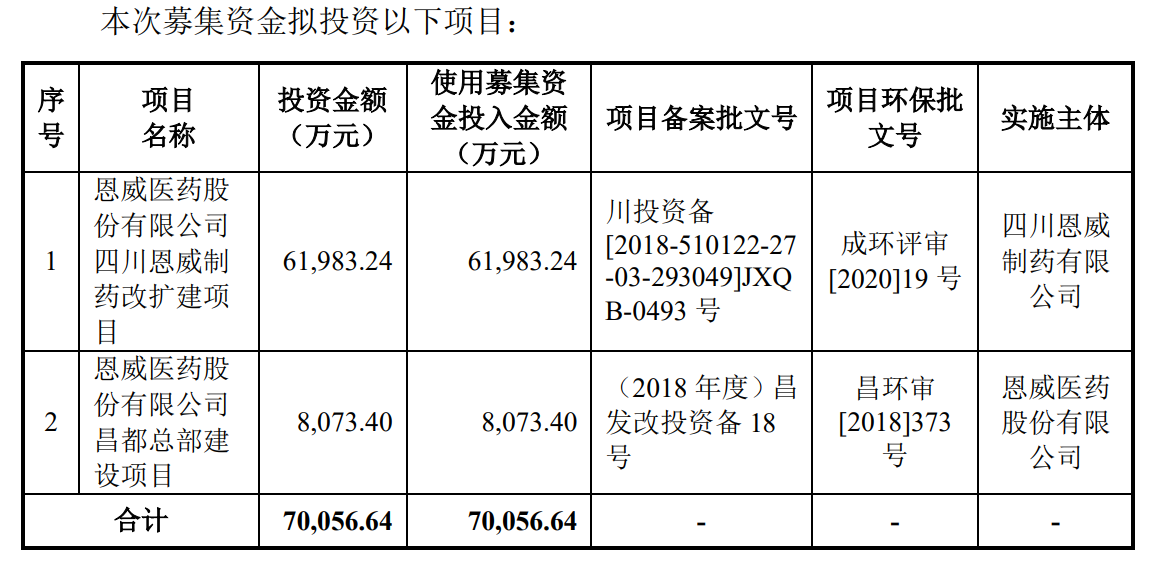 此番恩威医药拟募约7亿元,其中“恩威医药股份有限公司四川恩威制药扩建项目”的计划投入额达6.2亿元,项目选址位于恩威制药的现有用地内。