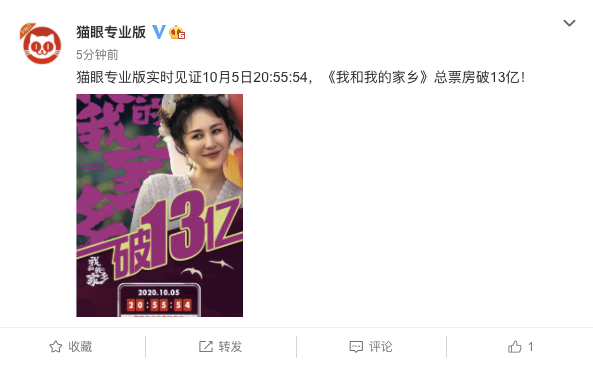 猫眼专业版官方微博5日晚间消息,截至10月5日20:55:54,《我和我的家乡》总票房破13亿元。