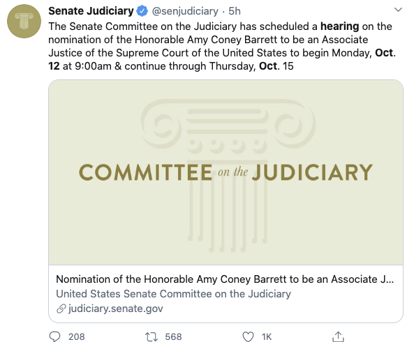 路透10月6日消息,美国参议院司法委员会周一宣布,将于10月12日为特朗普总统的最高法院大法官被提名人巴雷特(Amy Coney Barrett)举行确认听证会,表明新冠疫情爆发将不会干扰此事的时间表。