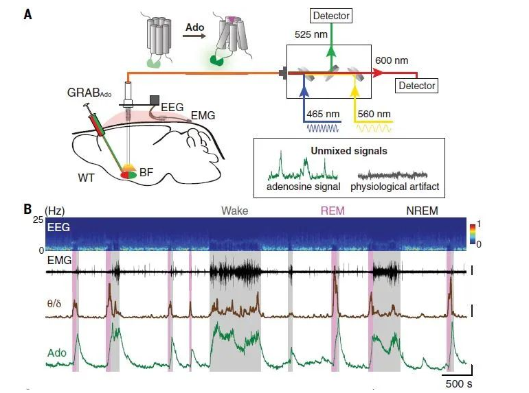 借助这种技术手段,研究人员针对小鼠的基底前脑区,即大脑中调控睡眠/觉醒的关键部位,观察了胞外腺苷浓度的变化,发现神经元活动与腺苷浓度变化密切相关。
