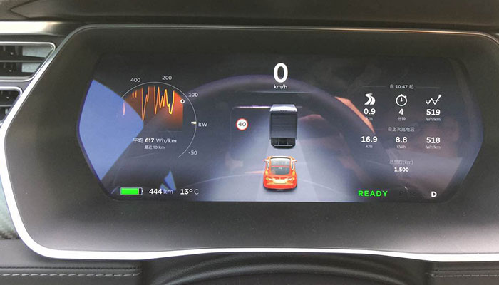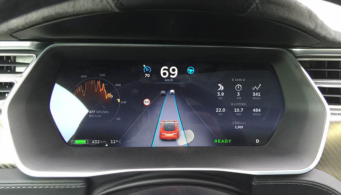 7.1系统的实时道路信息显示功能也得到进一步提升,能够提供更多关于车辆周围的信息。仪表板能显示Model S车前部附近的车辆信息,并且可以通过不同的图标显示出不同车辆类型如小客车、货车及摩托车等。