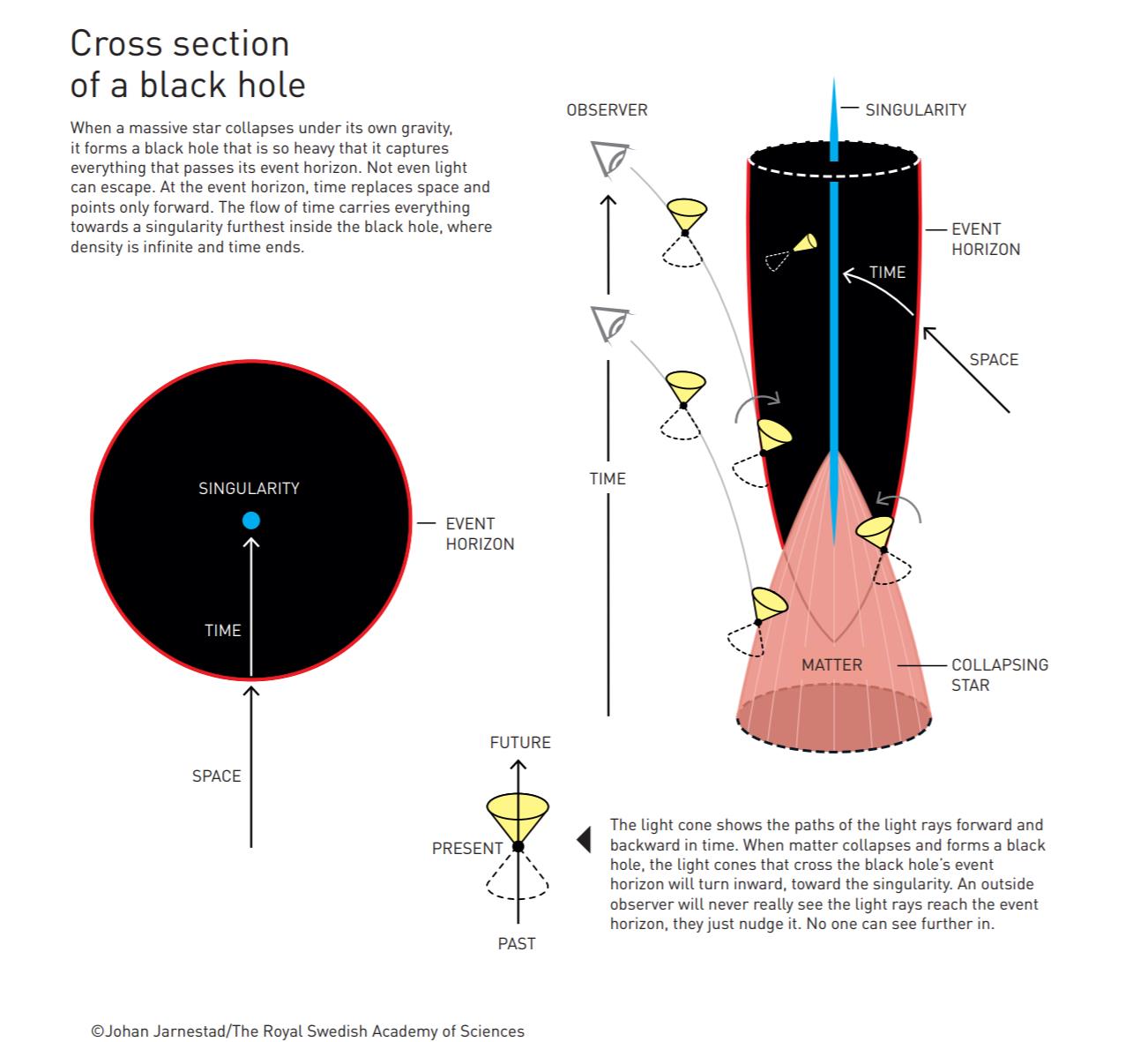 按照彭罗斯的描述,黑洞的核心隐藏着一个奇点(singularity),在这个奇点中,所有已知的自然法则都会消失。诺贝尔奖委员会指出,这项开创性的成果是自爱因斯坦之后对广义相对论做出的最重要的研究贡献。