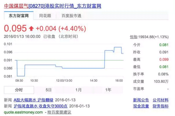 2011年11月22日,河南省首家在港上市煤矿企业中国煤层气(00578),在没有任何公告及负面传闻的情况下,早盘开市便股价极速下跌,最低从当日开盘0.53港元急跌至0.07港元,最终全日跌幅82.59%,收报0.094港元。一个交易日内,公司市值由超过40亿港币干到不足8亿港币。