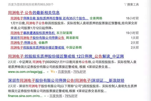 2016年1月11日晚,A股上市公司同洲电子公告,控股股东、实际控制人袁明质押的股票接近预警线,经向深交所申请,公司股票1月12日起停牌。公开信息显示,袁明将其持有的超过90%的同洲电子股票用于了质押融资,而公司最新股价10.03元,已距离该质押预警线不到15%。