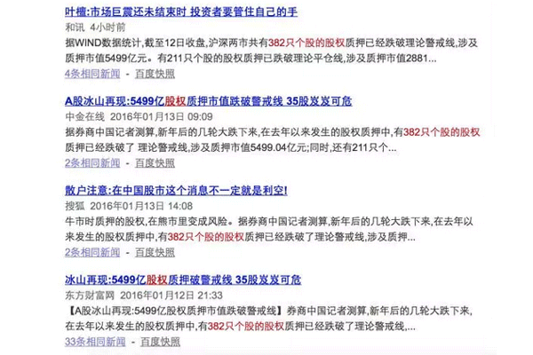 在整个A股市场,同洲电子不但不只是个案,而且还是相对要好的。券商中国的数据显示:截止2016年1月12日,A股已有382只个股的股权质押跌破理论警戒线,涉及质押市值5499.04亿元;同时,还有211只个股的股权质押已跌破理论平仓线,涉及质押市值2880.78亿元。而今日(1月13),大盘跌破3000点,众多股票跌幅超过5%,意味着这一数据又有新变化,更坏的变化。
