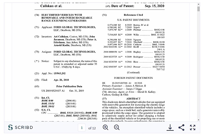 当然,这类发明最大的问题可能是成本。 福特没有在专利申请中提到这一增程包的价格。 购买价格只是其中的一部分。 就车队和其他商业用户而言,电动汽车的最大卖点之一是其较低的运营成本,添加增程装置可能会使电动化运营方案失去优势。