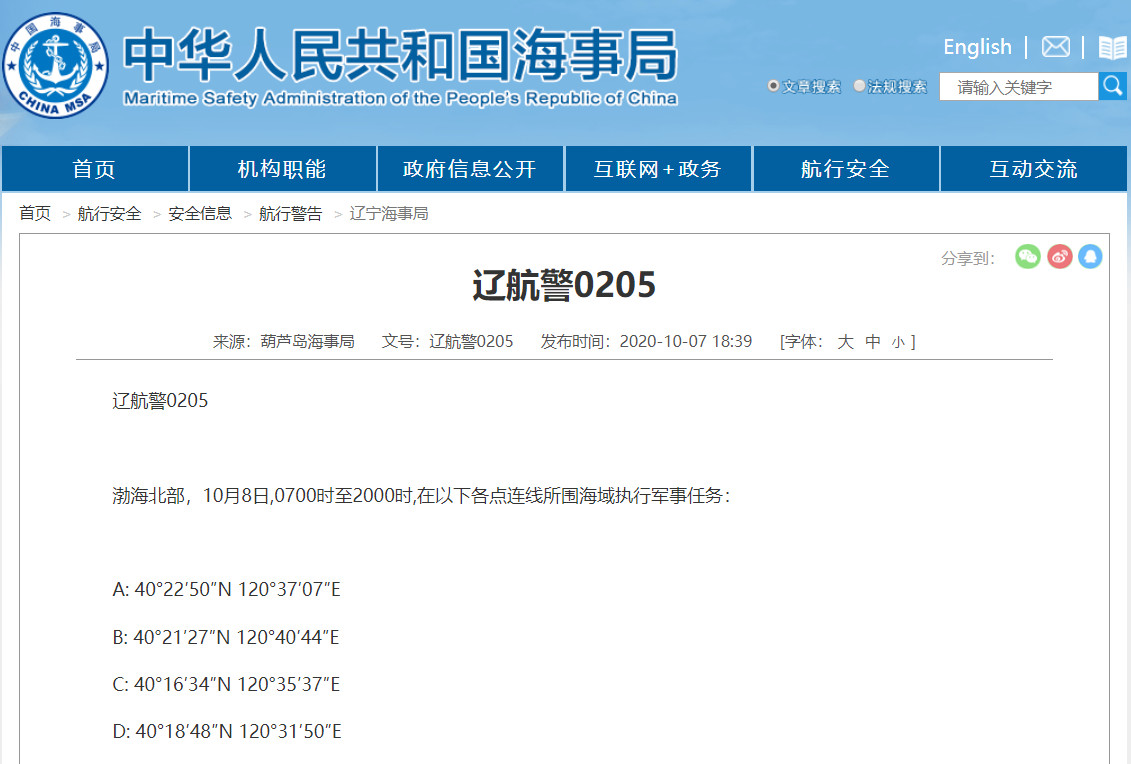 葫芦岛海事局发布航行警告:辽航警0205,渤海北部,10月8日,0700时至2000时,在以下各点连线所围海域执行军事任务: