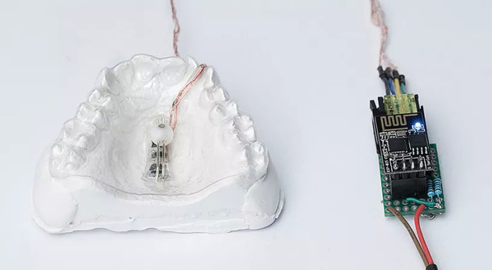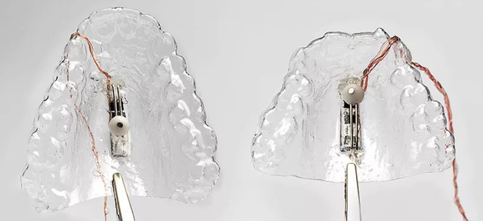 出于安全性和卫生考虑,Tong的材料采用一种热塑性素材PETG,然后可用每个人不同的牙印在上面制成贴合上颚的固定器。电子设备则用一层薄膜样的硅材料密封,避免穿戴者受到电击。