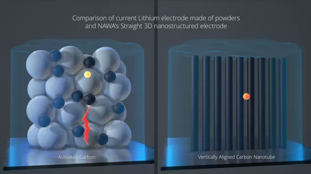 另一方面,Nawa垂直排列的碳纳米管创造了一个更像毛刷的阳极或阴极结构,每平方厘米就有1000亿个笔直的高导电纳米管伸出。其结果则是离子的平均自由程(电荷进出电池所需的距离)急剧缩短,因为每一滴锂都或多或少地直接连接到纳米管上,纳米管充当了直线高速公路和集电器的一部分。