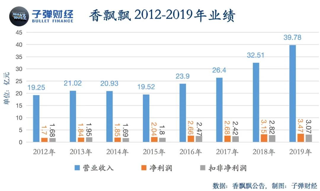 2012-2015年,依赖冲泡奶茶业务的香飘飘发展明显已进入瓶颈期,营收大多在20亿元左右,2014、2015年甚至出现负增长,净利润则大多在2亿元以下。新品类推出后的2018、2019年,香飘飘营收同比增长率分别达到23.13%、22.36%,净利润同比增长率分别达到17.53%、10.39%。2019年,香飘飘营收近40亿元,净利润近3.5亿元。