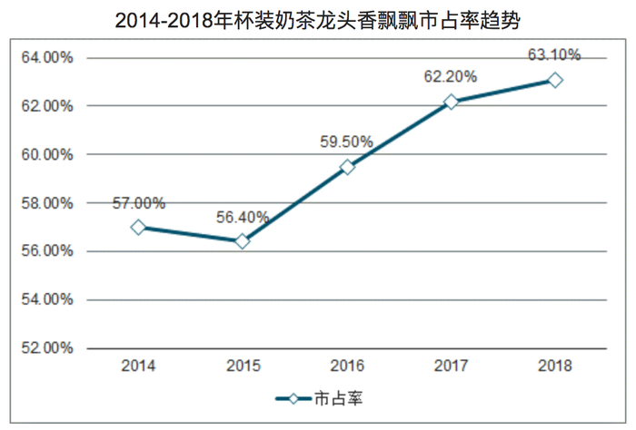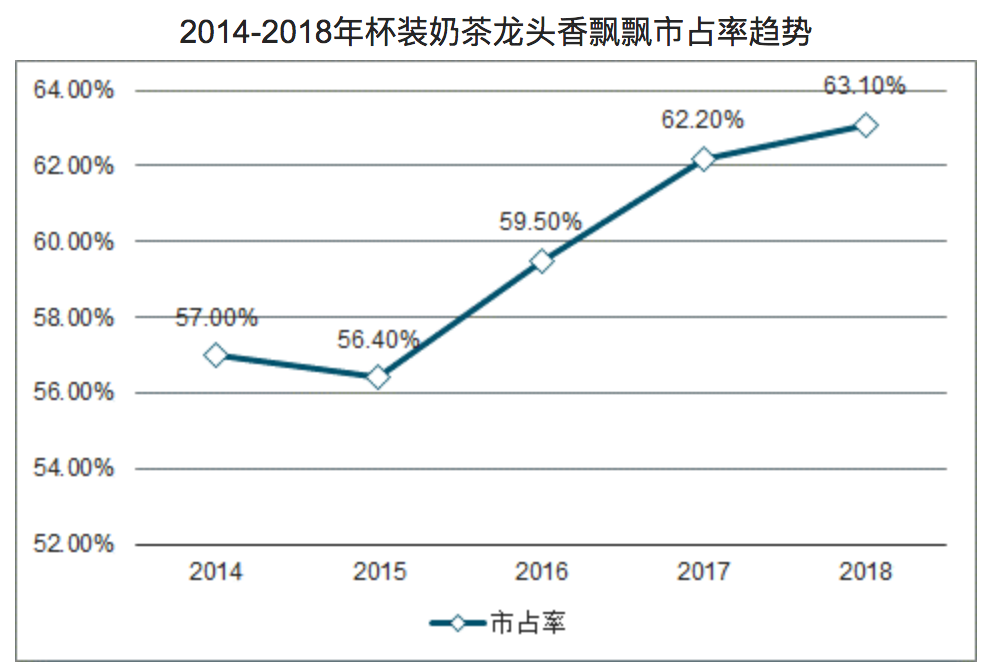 经过多年优胜劣汰的市场选择,固体奶茶的竞争格局已基本确定,香飘飘、优乐美及香约等品牌是杯装及盒袋装奶茶的主要玩家,其中香飘飘更是已占据半壁江山。智研咨询数据显示,香飘飘在杯装奶茶的市占率已由2014年的57%上升到了2018年的63.1%。
