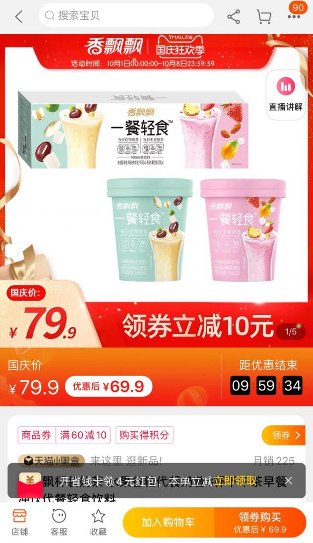 「子弹财经」走访北京市多家线下商超,并未发现香飘飘麦片和奶昔产品。在香飘飘天猫旗舰店内,也未搜索到麦片产品。而奶昔产品的销量也并不高,截至10月7日,奶昔产品8杯券后价为69.9元,月销只有225单。
