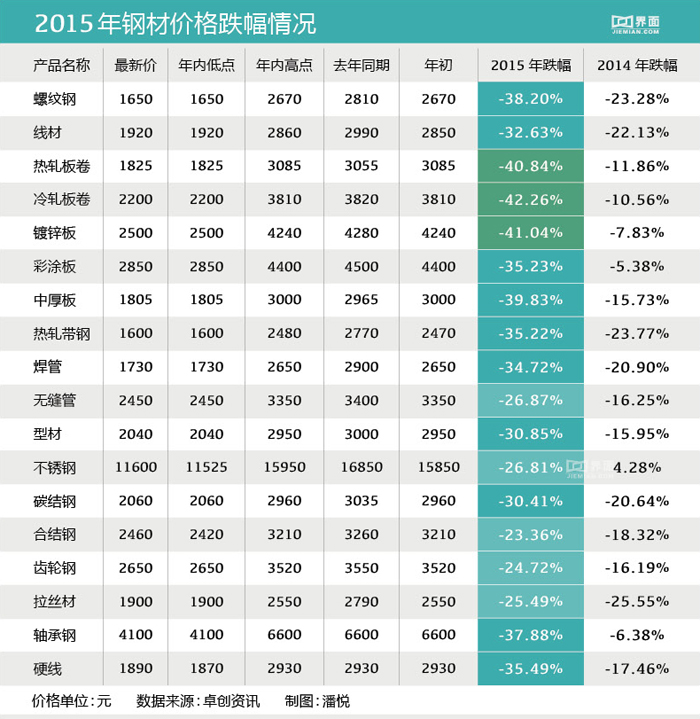 卓创资讯统计数据显示,去年国内的钢材交易额同比缩水10.5%至3891亿元。从价格跌幅上看,除拉丝材基本持平外,其他产品价格跌幅均较上年明显扩大。2014年最大跌幅产品为拉丝材,价格跌幅为25.55%,去年跌幅最小的产品合结钢跌幅为23.36%,冷轧板卷跌幅为42.26%。此外,镀锌板和热轧板卷的全年跌幅亦超过40%。