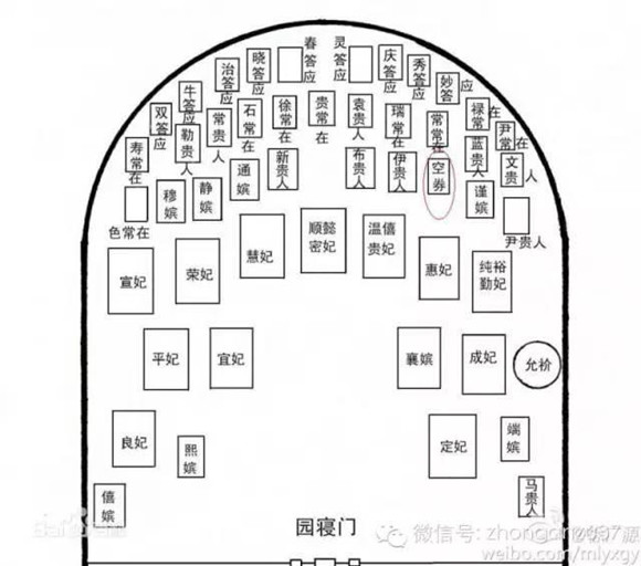 据清代陵寝和后妃的研究学者徐广源微博介绍,园寝内从南往北,前四排基本为妃、嫔,后三排依次为贵人、常在、答应。其中,被盗的温僖贵妃宝顶位于第四排中间靠右位置。温僖贵妃是景陵妃园寝内埋葬的唯一一位贵妃。
