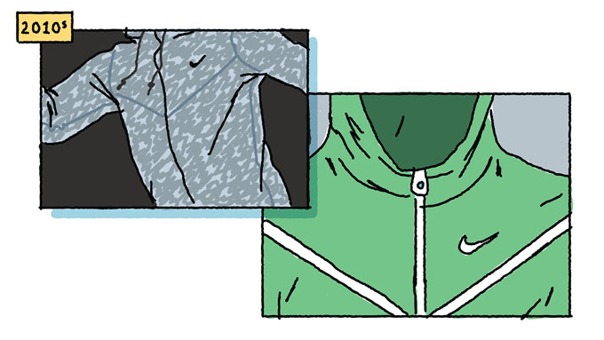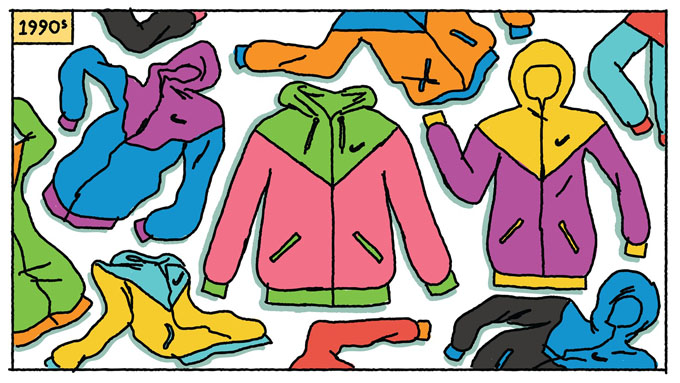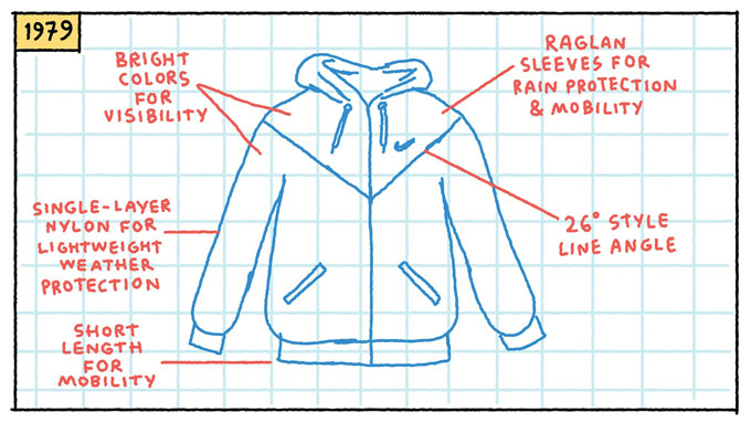 随着设计团队不断对产品的材质进行改善,1984年,夹克的受欢迎程度飙升——这件可抵挡各种天气状况的衣服,很快俘获了一批运动精英和跑步爱好者。
