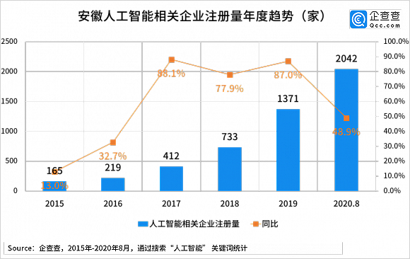 企查查数据显示,从2017年开始,安徽大力发展人工智能产业,虽然目前与长三角其他地区相比仍有一些差距,但从环比增速来看,安徽人工智能相关企业注册量已经连续3年保持在70%-80%左右,可谓是奋起直追,加之科大讯飞的带头示范作用,安徽的人工智能产业未来有着很大的想象空间。