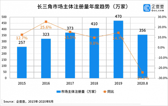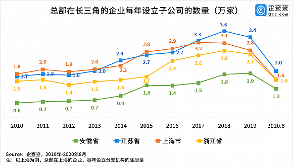 企查查数据显示,过去十年“长三角血统企业”的注册量翻了一番,2010年总部在长三角地区的企业新增子公司5.7万家,而2019年新增子公司达10.8万家。