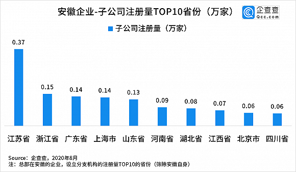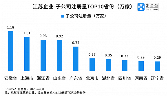 子公司的地域分布代表了企业的辐射范围。企查查数据显示,江苏企业的辐射TOP3省份分别是安徽、上海和浙江,在安徽设立子公司1.18万家,在上海设立子公司1.01万家,在浙江设立子公司0.93万家,不仅都在长三角范围内,而且数量上十分均衡。