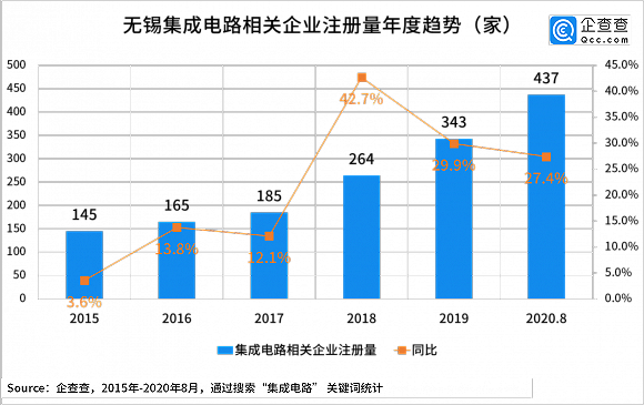 企查查数据显示,2018年无锡集成电路相关企业从185家激增至264家,同比增速高达42.7%,2019年与2020年亦保持了近30%的同比增速,无锡建设集成电路重镇的发展目标与思路越来越清晰。