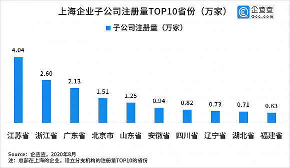 企查查数据显示,上海企业的辐射TOP3省份分别是江苏、浙江、广东,再往后还有北京、山东,安徽被挤到第六名,作为长三角经济圈的大明星,上海的心思有点儿野。上海企业最“喜欢”在江苏设立子公司,数量达到4.04万家,约是浙江(2.6万家)的两倍。