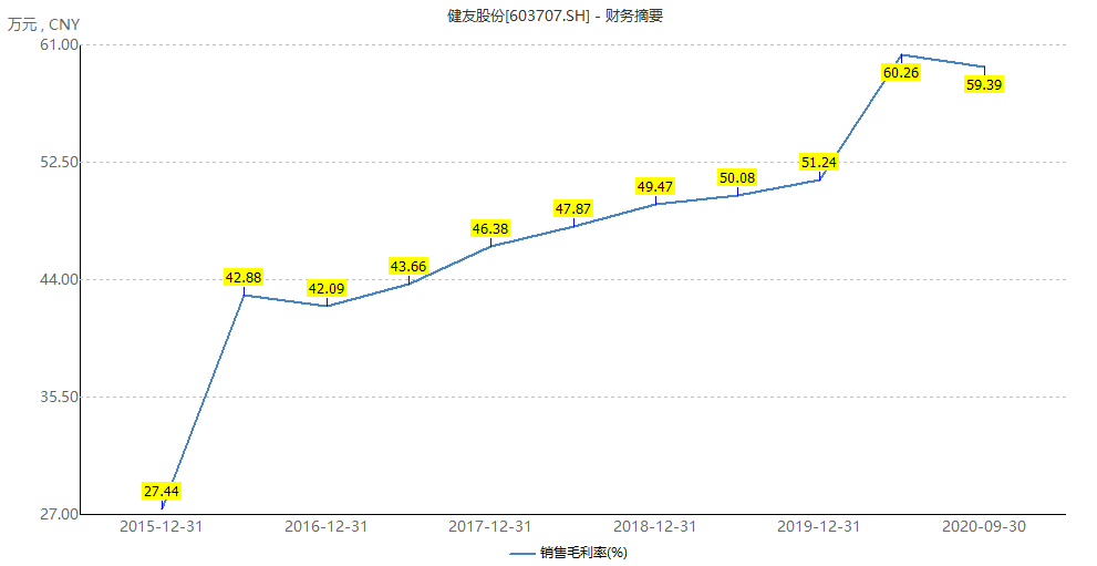健友股份销售毛利率由上市之初的43%左右上升至2020年前三季度的60%。今年第三季度的销售毛利率较上半年虽略有下滑,但仍维持在高位。